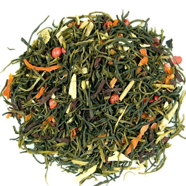 Thé vert, ashwaganda*, gingembre, carotte, betterave rouge, poivre rose.